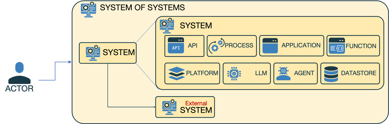 Technology Architecture: Contains deployable or discoverable components. They are actual instances, they are called physical components. Components in the Technology layer are SaaS System, Application, Function, Platform, AI Agents, Models, Data, Data Store, Infrastructure and Trust zone.