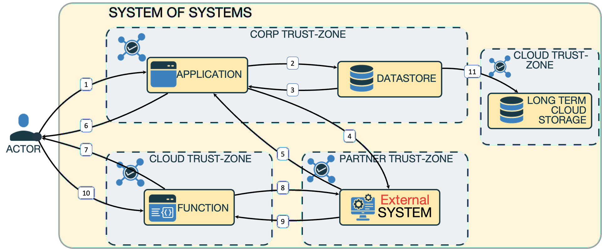 Dataflow Architecture: Contains dataflow design component types which are mainly for processing and storing data. They are Application components which handle data, Data, Data Store and Trust zone.