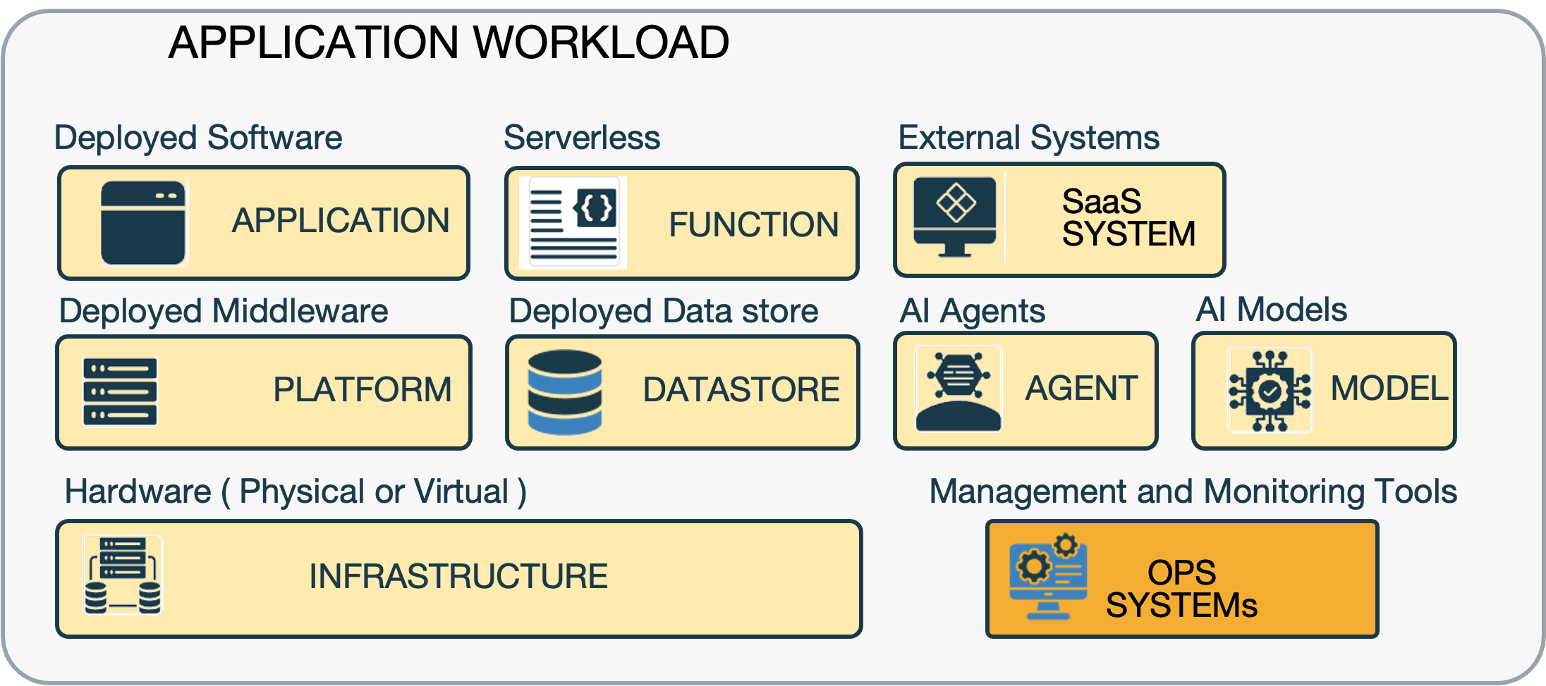 Application Architecture: Contains design time logical component types as they represent generic components. Application layer contains Actor, System, API, Process, Application, Function, AI Agents, Models,Platform, Data, Data Store components.
