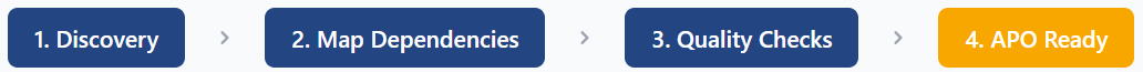 Application dependencies are mapped for APO Analysis with complete traceability from business value to technical implementation.