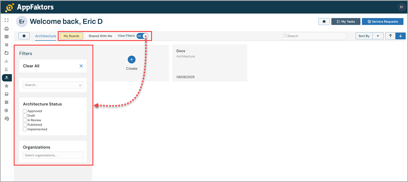 Once you select the Architecture tile, your personalized dashboard appears, featuring My Boards, Shared With Me , and View Filters.