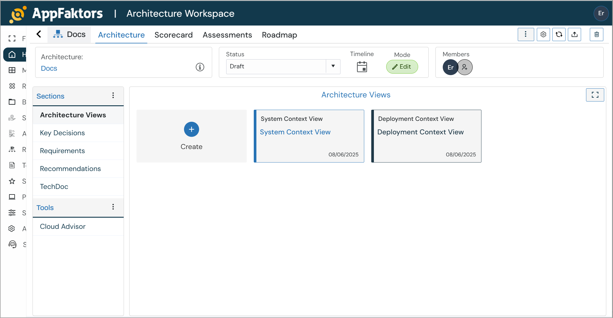 The AppFaktors Architecture Workspace is a comprehensive platform for designing, managing, and documenting enterprise architectures. This workspace provides tools for creating architecture blueprints, managing requirements, conducting assessments, and tracking project roadmaps.