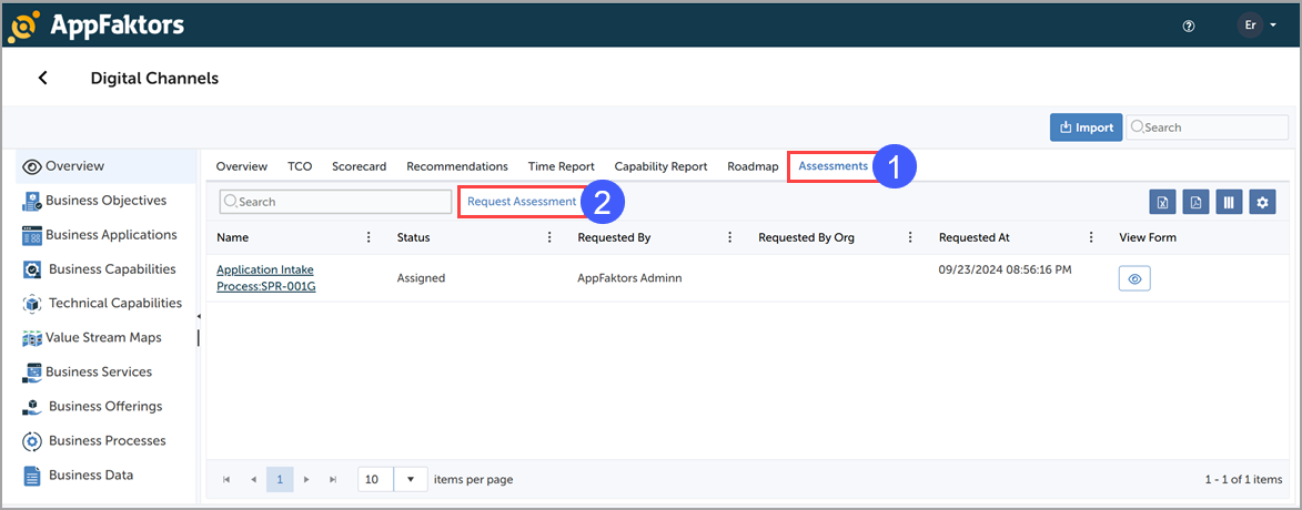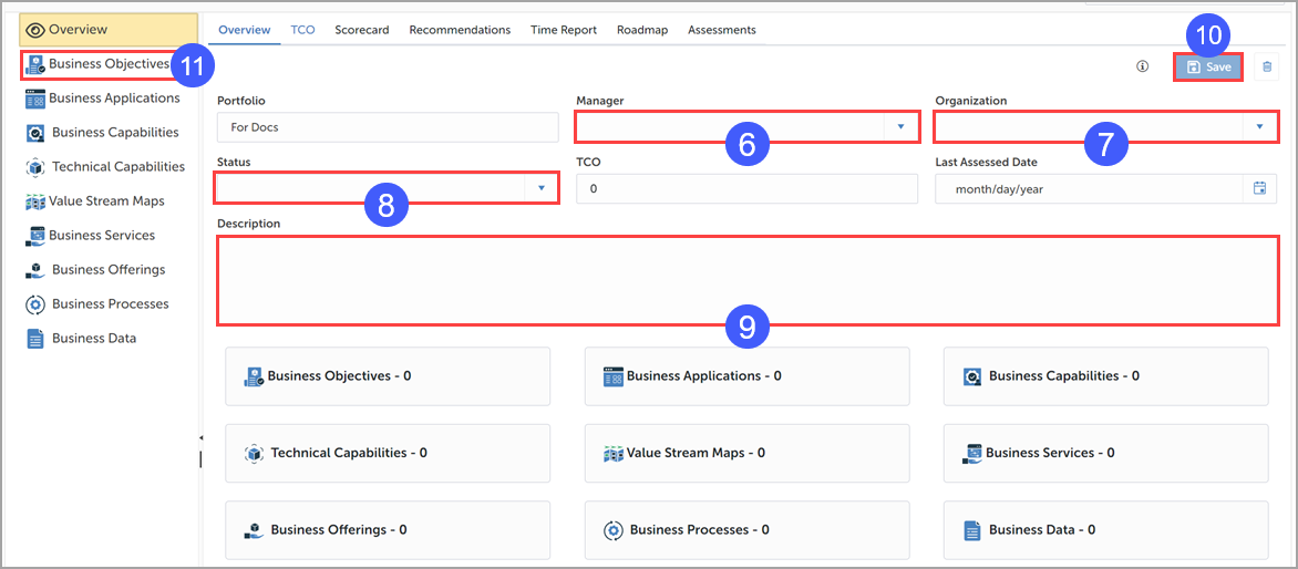 Select Business Objectives from the left menu to begin assigning business objects to the portfolio.