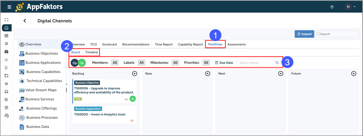 - Repeat for business capabilities, technical capabilities, value stream maps, business services, business offerings, business processes, and business data as needed.