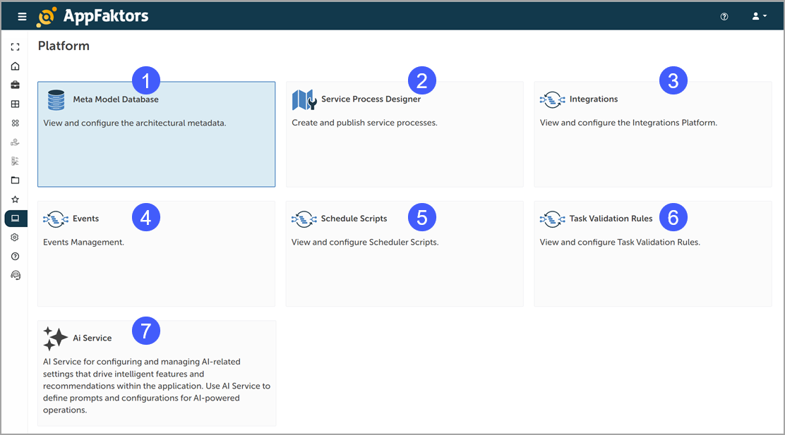 The Platform page in AppFaktors provides access to core functionalities and tools that support the overall management and configuration of your IT architecture and processes.