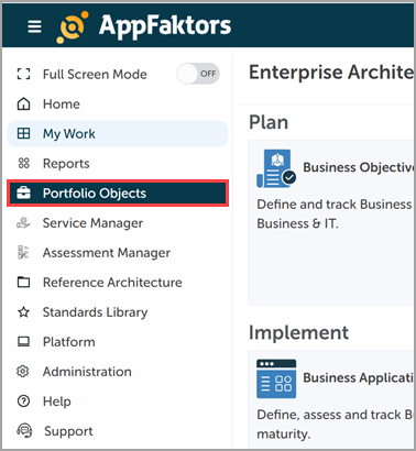 Use the Business Architecture page to create and view the business objects for inclusion in your portfolios. To view and create portfolios in which you include the business objects described on this page, see Managing portfolios.