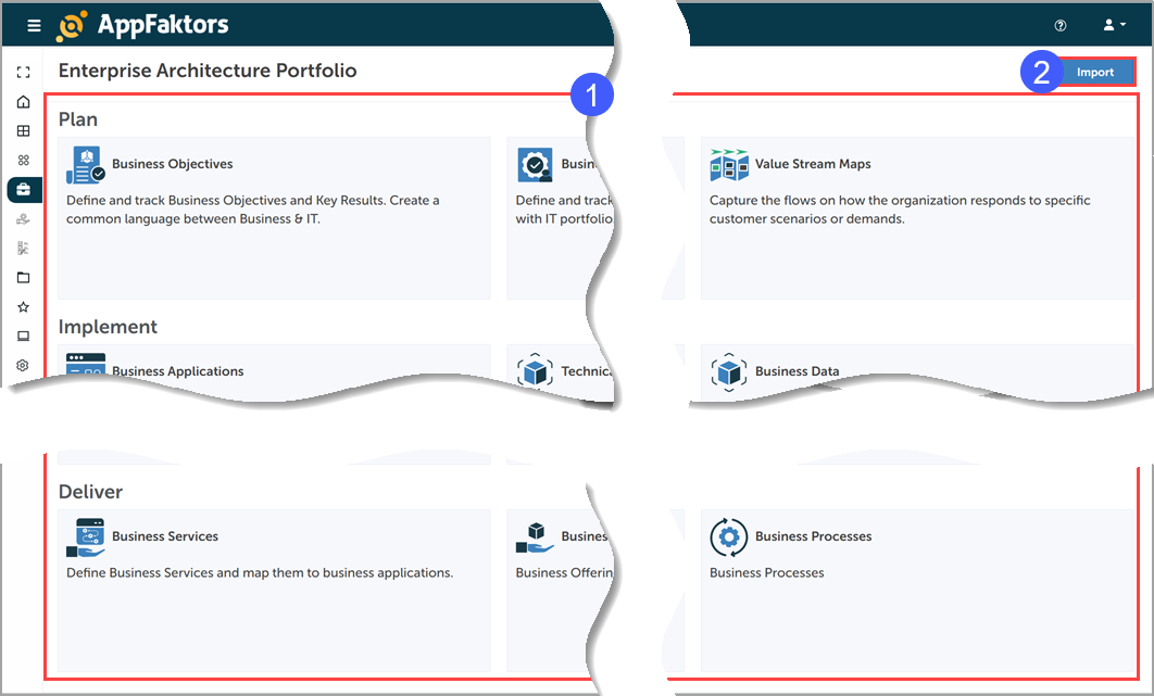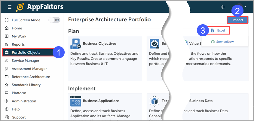 Import - Use to import Business Architecture from ServiceNow or Excel.