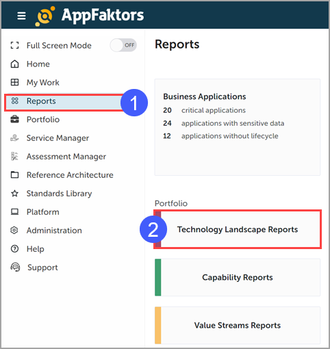 - Use these visualizations to gain insights into your application portfolio, business capabilities, and technology adoption status.